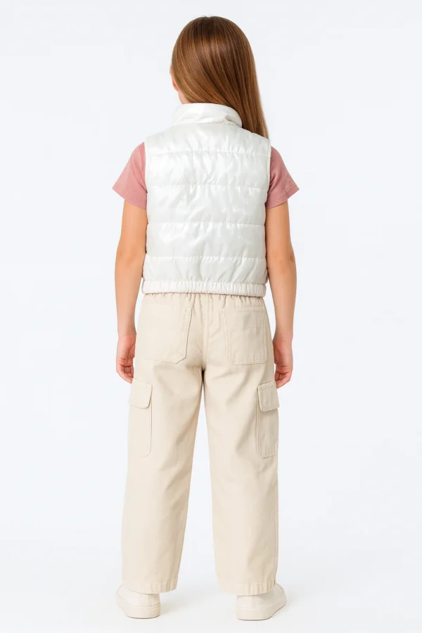 Este set combina estilo y comodidad con un chaleco puffer brillante, una camiseta rosa suave y pantalones cargo color crema. Un look moderno y versátil que realza la personalidad de las niñas con un toque delicado y actual.