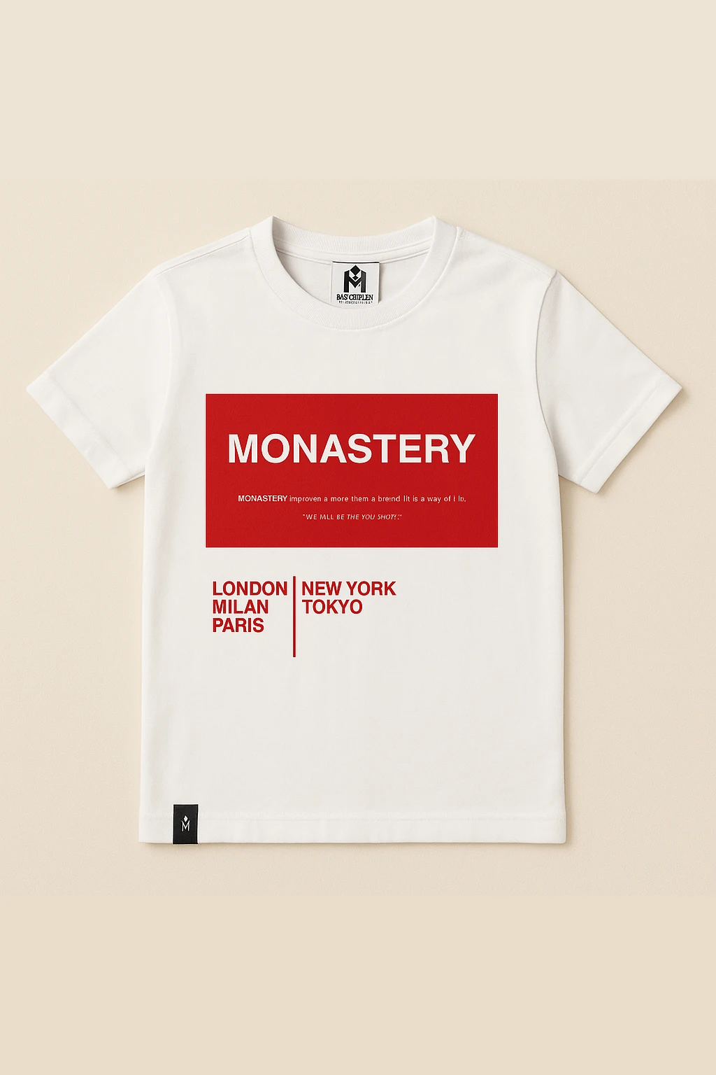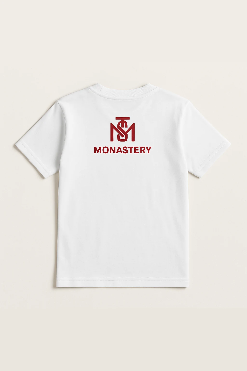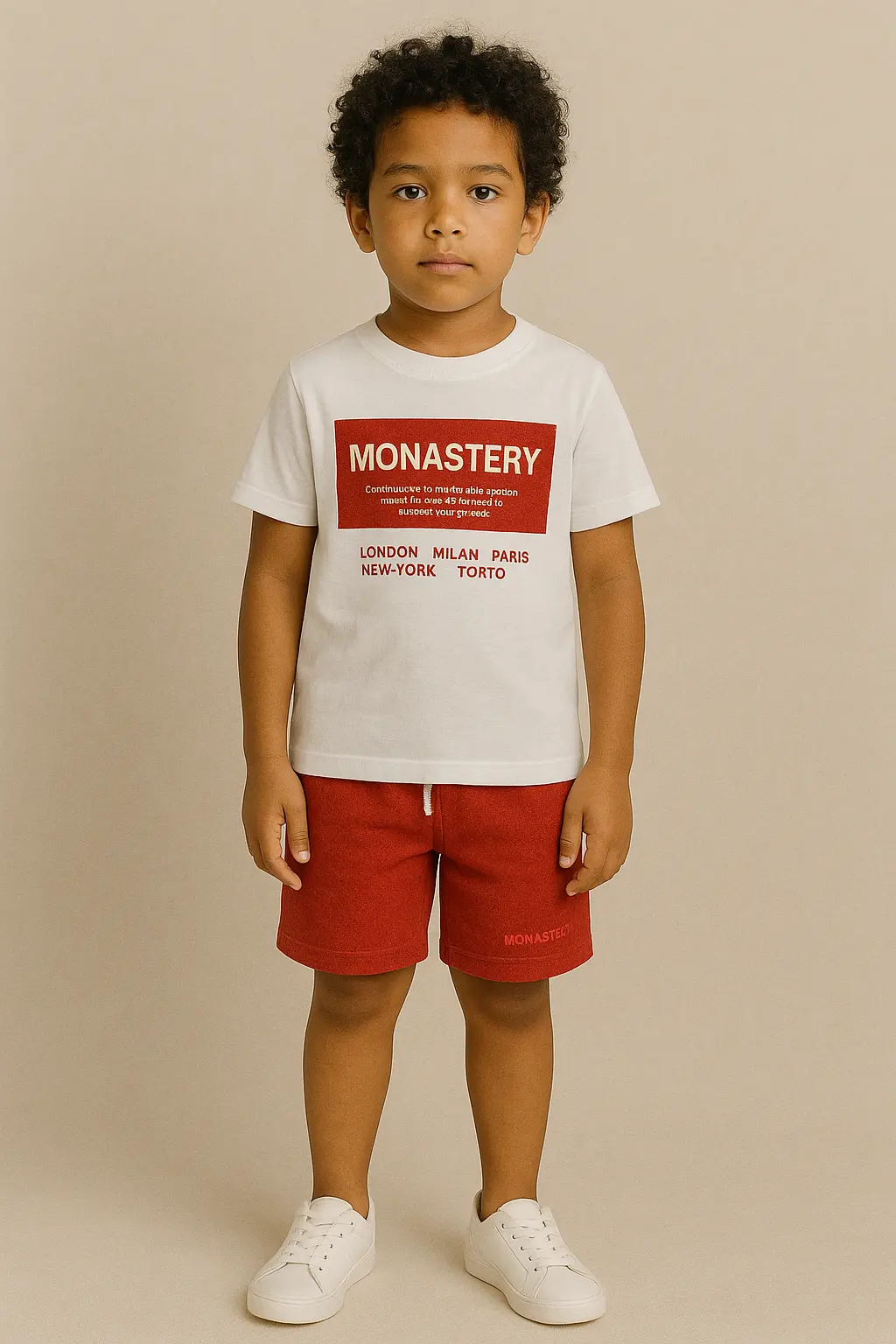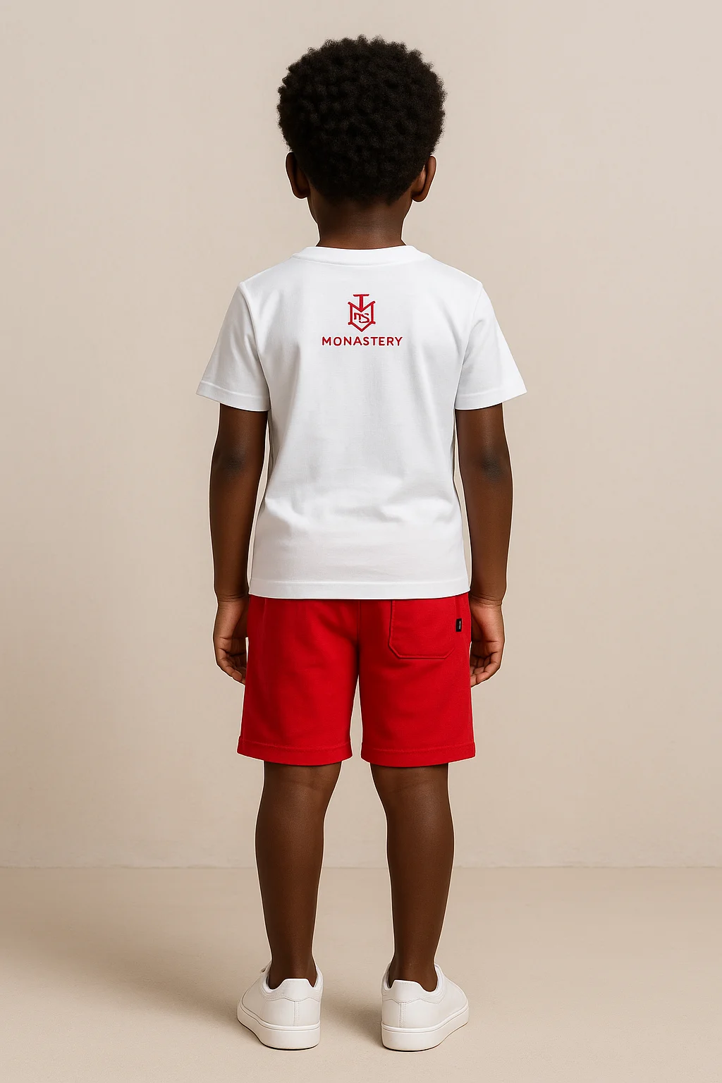 Camiseta blanca con el icónico logo MONASTERY en rojo y short rojo con cordón blanco, diseño cómodo y moderno.