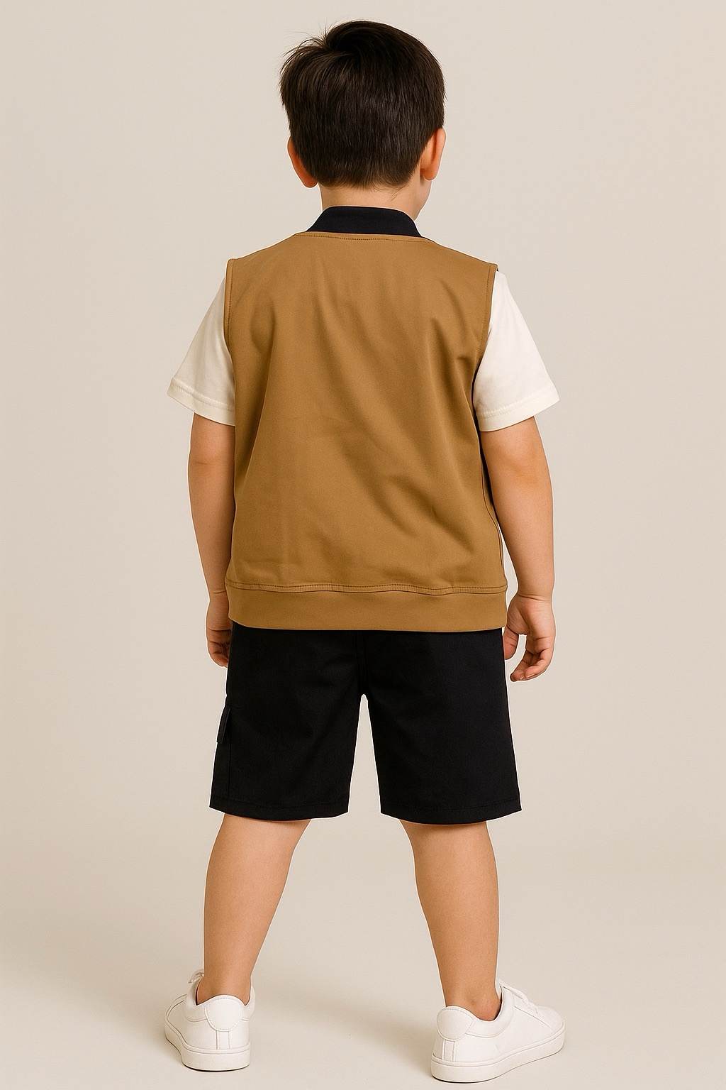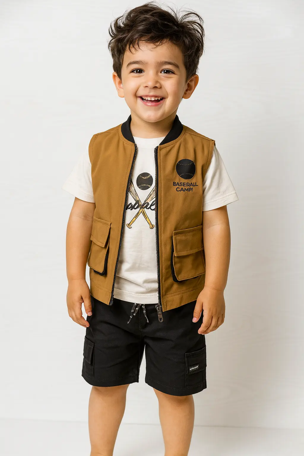 Este conjunto infantil combina estilo y comodidad para que los pequeños luzcan modernos en cualquier ocasión. La chaqueta ligera en tono camel, la camiseta estampada y los shorts negros crean un look fresco y urbano perfecto para días activos. Su diseño alegre y juvenil permite que los niños se muevan con libertad mientras se ven increíbles.