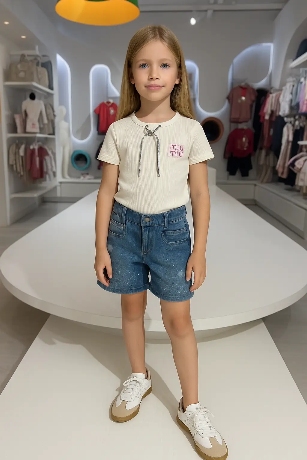 Conjunto moderno para niña que combina blusa blanca en tela rib con estampado central de osito en strass y texto “Tropical Paradise – Endless Summer – Since 1986”. El pantalón denim gris lavado destaca por su pretina elástica, bolsillos traseros con detalle en strass y parches desgastados tipo destroyer, que le dan un estilo urbano y sofisticado.
