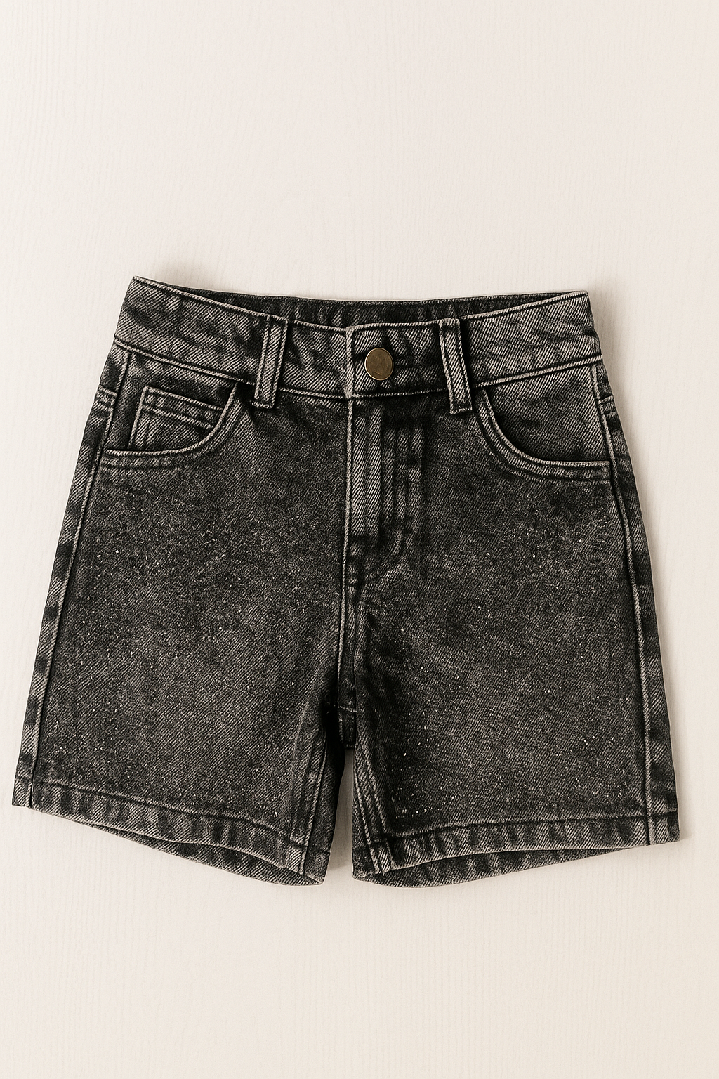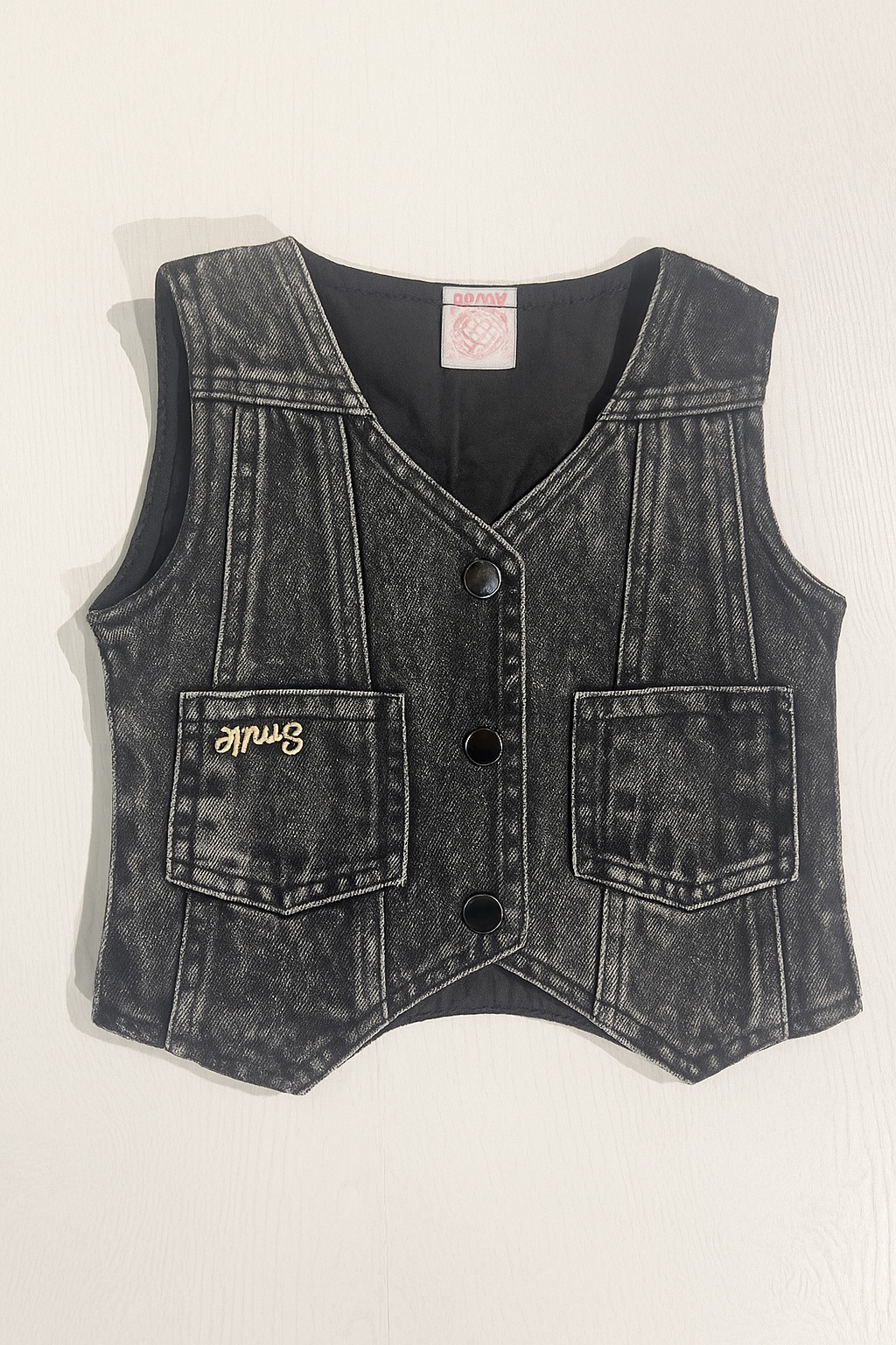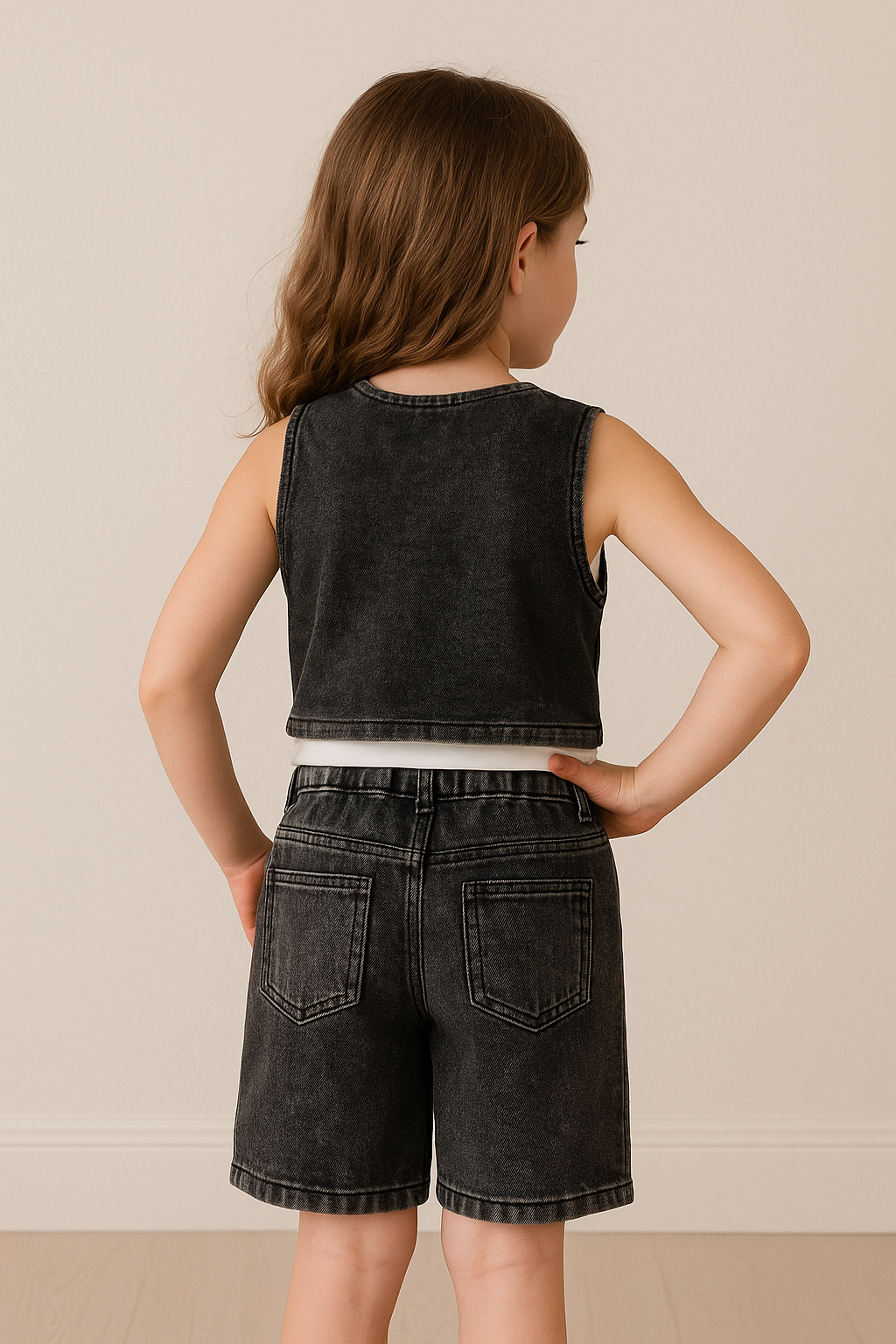 El set incluye un chaleco de mezclilla sin mangas con botones metálicos frontales y bolsillos decorativos, acompañado de shorts a juego con pretina ajustable. La mezclilla suave y ligera brinda comodidad, mientras que el tono gris desgastado añade un estilo urbano muy actual. Cada pieza está diseñada para resistir el uso diario sin perder su forma ni color.