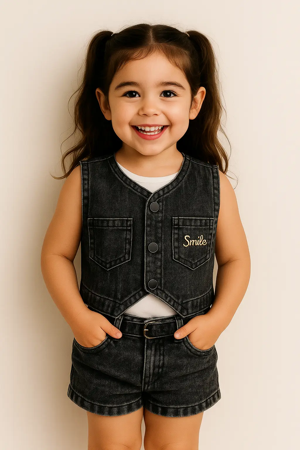 Este adorable conjunto denim le da a la pequeña un estilo moderno y lleno de personalidad. El chaleco y los shorts en mezclilla desgastada crean un look fresco y auténtico, perfecto para cualquier ocasión casual. Su sonrisa radiante y el diseño cómodo hacen que este outfit sea ideal para destacar su ternura con un toque fashion.