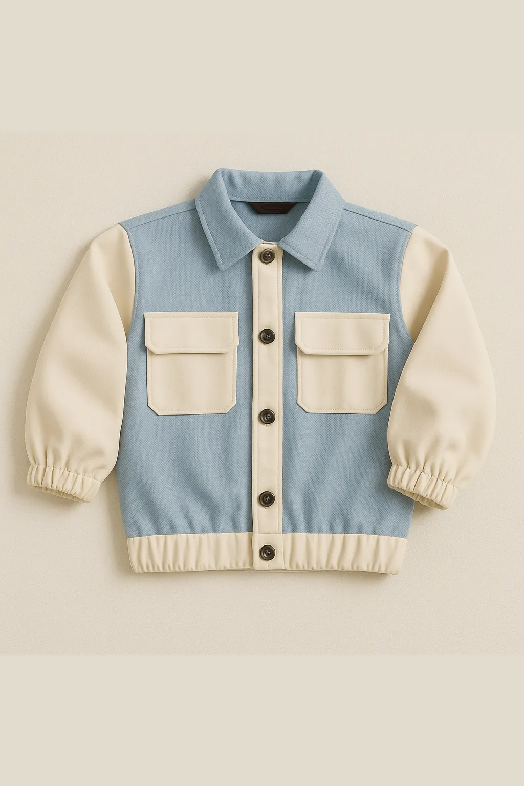 Este conjunto destaca por su diseño moderno y confortable. La chaqueta combina tonos azul pastel y crema con bolsillos frontales, botones contrastantes y acabado suave al tacto. El pantalón de mezclilla azul claro complementa perfectamente, con textura elástica, costuras resistentes y un ajuste cómodo. Ideal para un look casual, fresco y con estilo.
