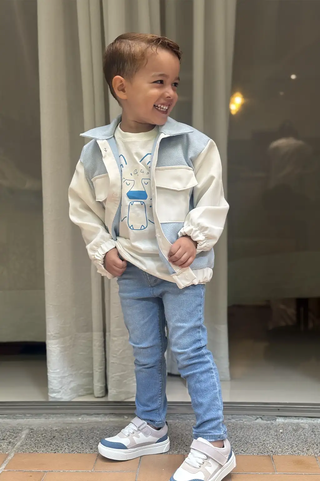 El conjunto combina una chaqueta en tonos azul pastel y crema con un pantalón de mezclilla azul claro. Confeccionado en algodón suave y materiales resistentes, ofrece comodidad, estilo y libertad de movimiento. Sus detalles cuidados, bolsillos funcionales y acabados de calidad lo hacen ideal para climas templados y ocasiones casuales.
