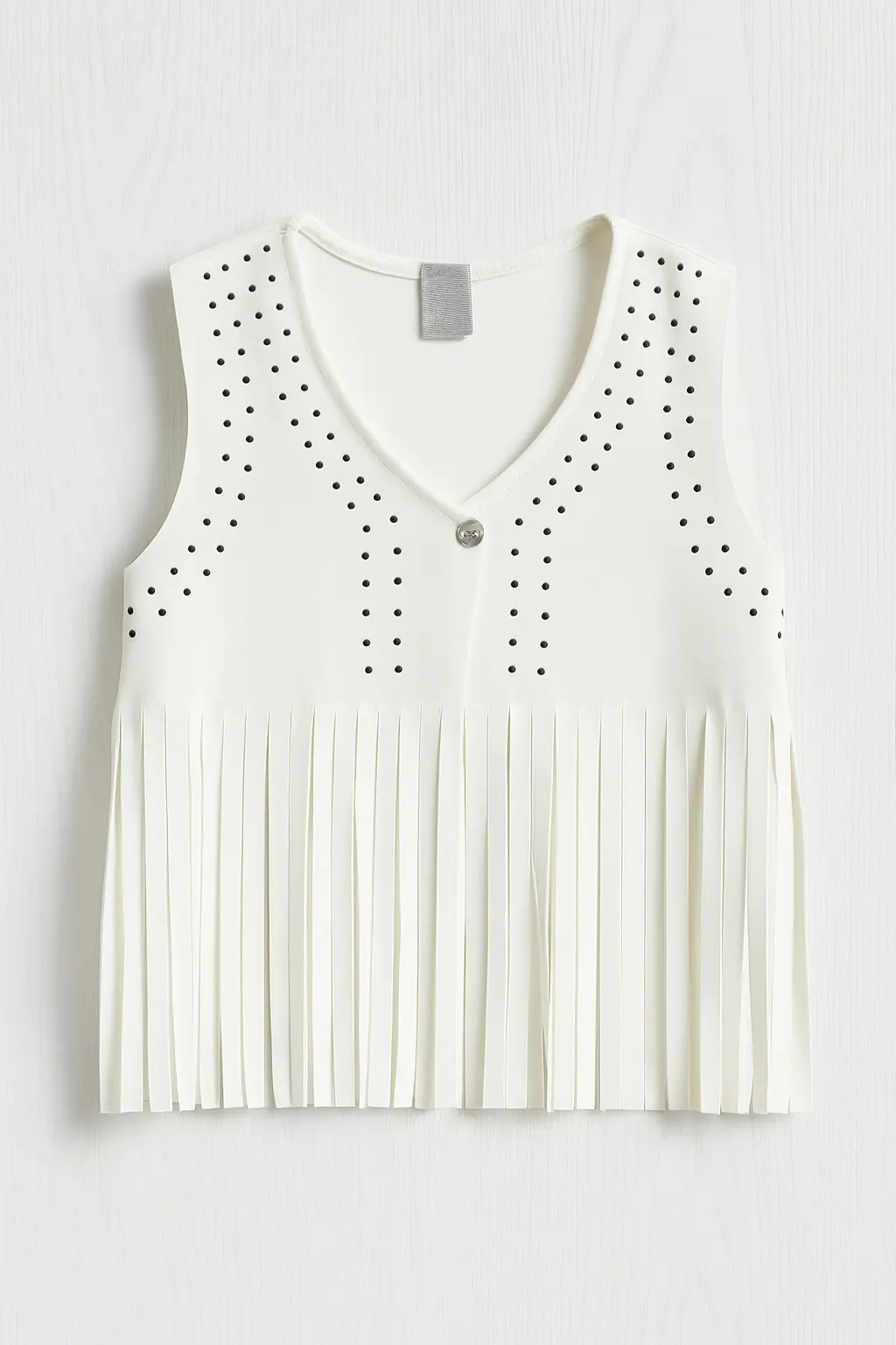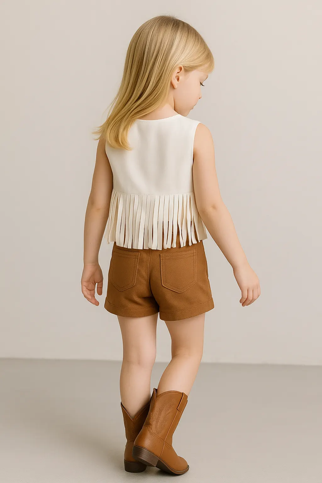 ¡Estilo vaquero con un toque moderno! Este conjunto infantil combina una blusa sin mangas con flecos y detalles metálicos que aportan movimiento y frescura, con shorts marrones de textura suave y botas cowboy a juego. Ideal para las pequeñas aventureras que aman destacar con comodidad y encanto.