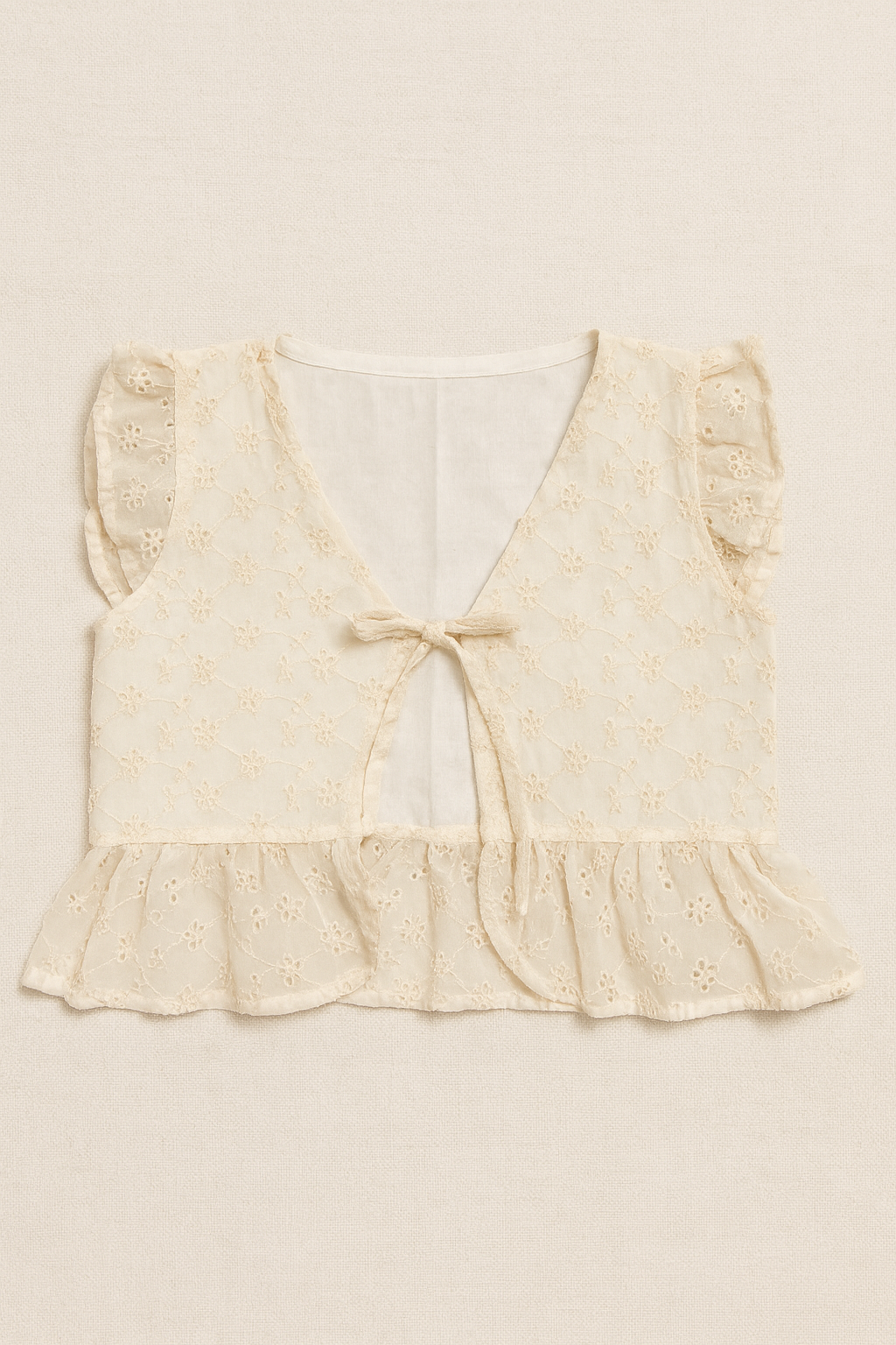 - Chaleco de encaje delicado con olanes y moñito frontal.
