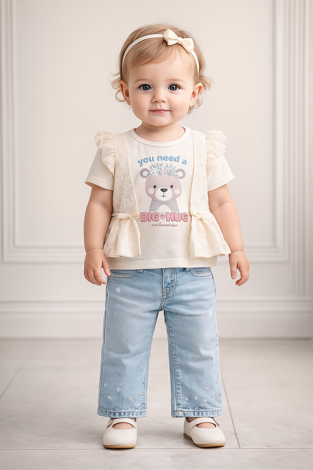 Un conjunto adorable que combina una blusita estampada con osito, chaleco de encaje delicado y jeans suaves con detalles florales. ¡Perfecto para lucir tierna, cómoda y con mucho estilo en cualquier ocasión!
