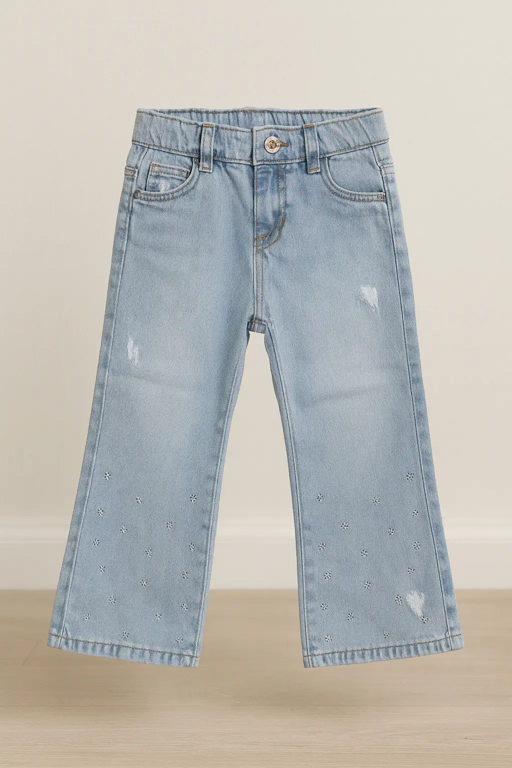 - Jeans de mezclilla ligera con flores bordadas.