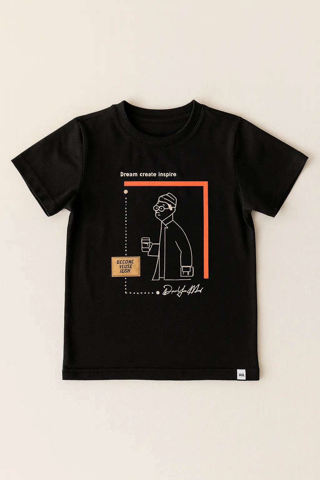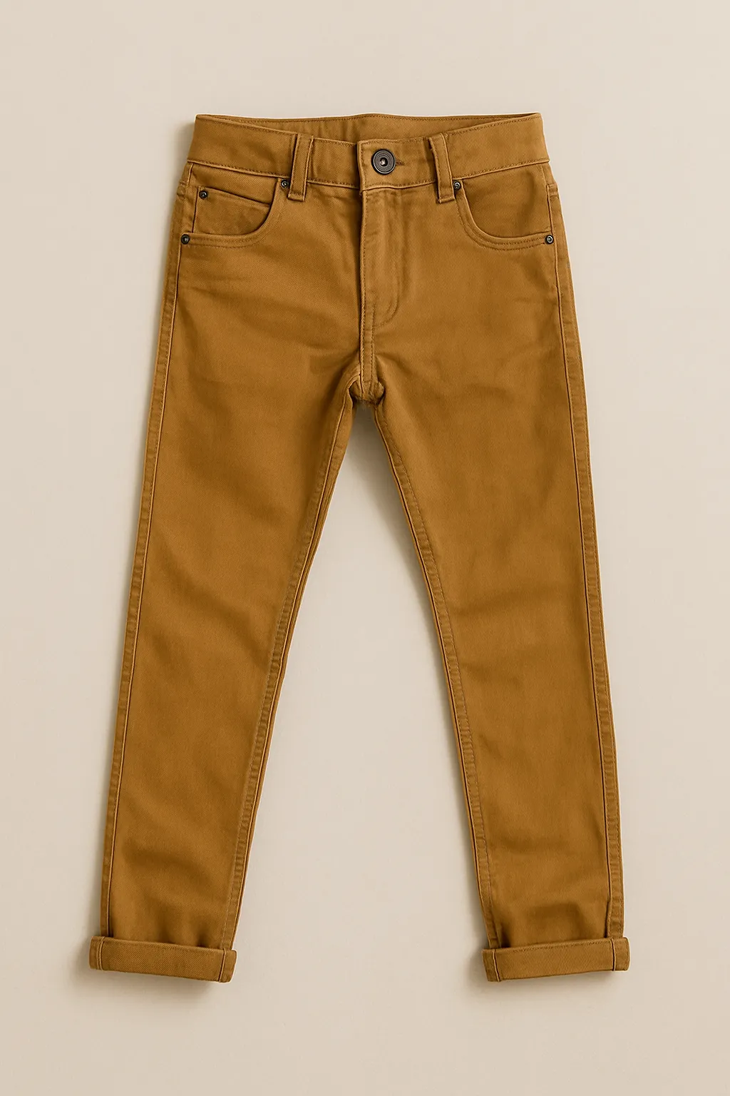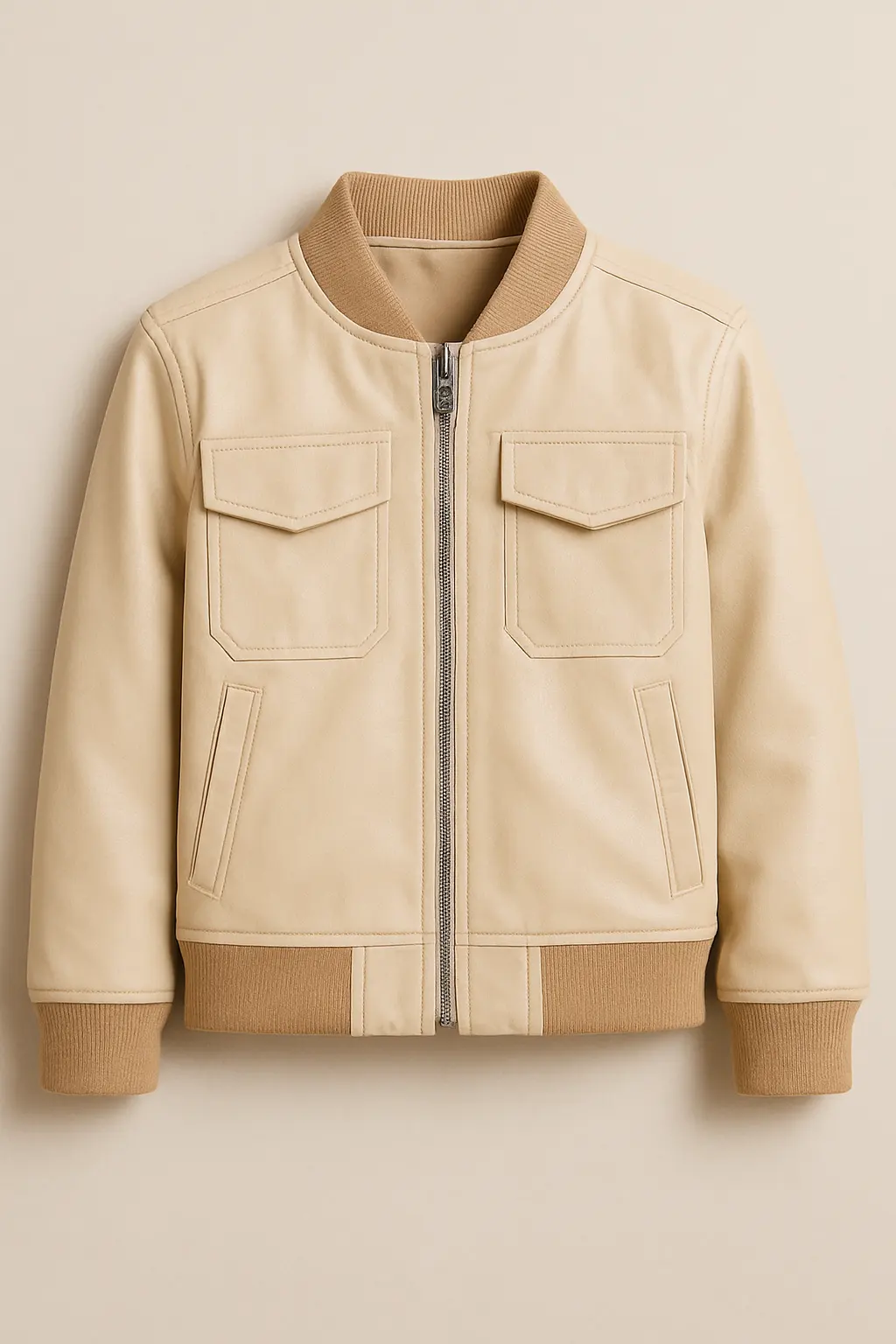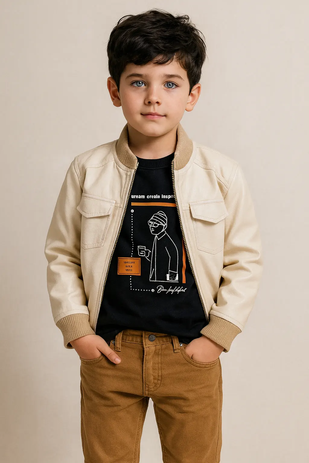 Conjunto moderno y versátil que combina una chaqueta beige de textura suave con puños acanalados, una camiseta negra con estampado artístico y pantalones camel, creando un look elegante, cómodo y lleno de estilo urbano para los pequeños con actitud.