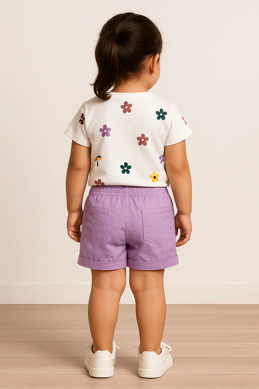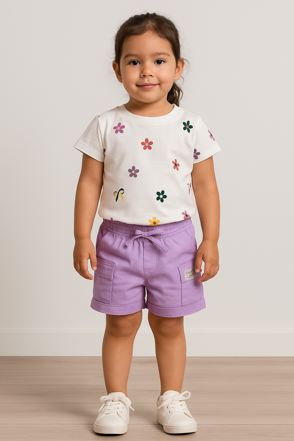 Conjunto fresco y moderno para bebes, compuesto por un short lila tipo cargo en bengalina y una blusa en algodón con estampado floral multicolor. Perfecto para días soleados y looks llenos de estilo.