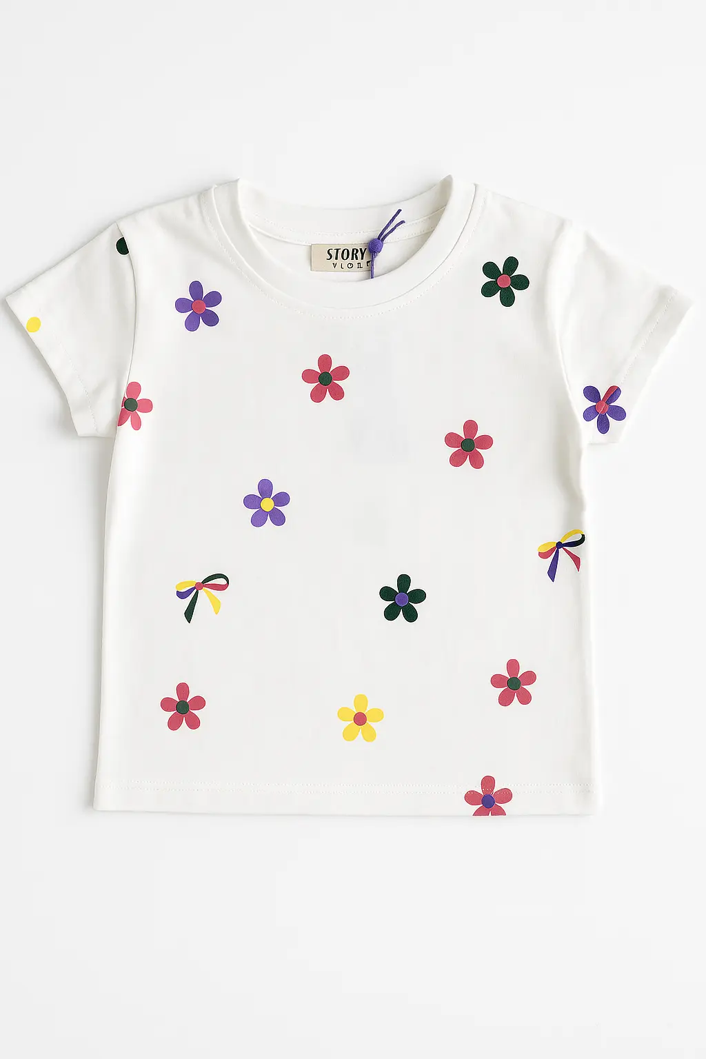 - Playera blanca con estampado de flores multicolor.