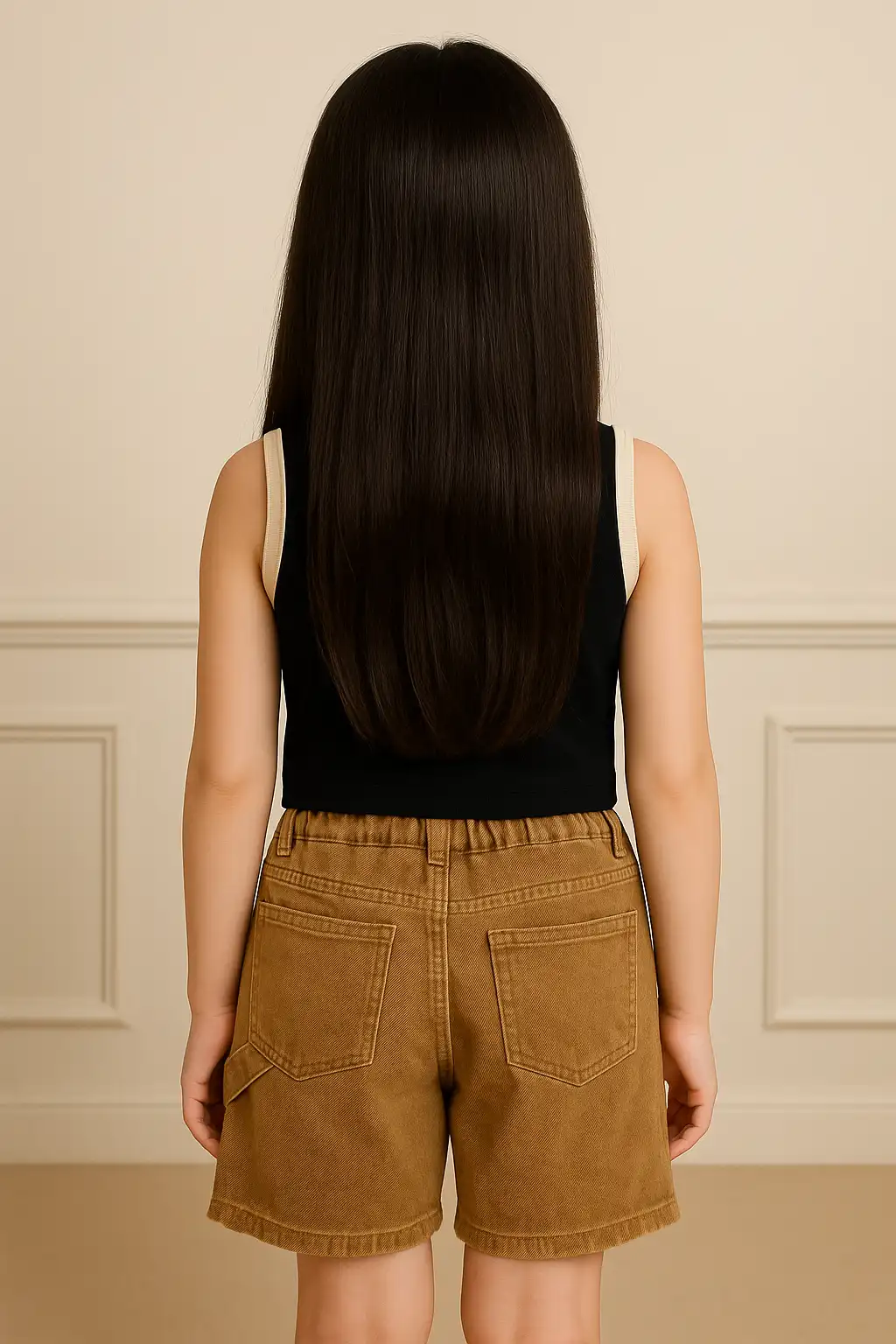 Este conjunto ofrece el equilibrio perfecto entre comodidad, estilo y versatilidad. Su top negro con detalles beige brinda un toque moderno y deportivo, mientras que los shorts beige de textura suave garantizan libertad de movimiento y frescura durante todo el día. Ideal para niñas activas y con personalidad, este look combina diseño, calidad y confort, adaptándose a cualquier ocasión con un aire casual y sofisticado.